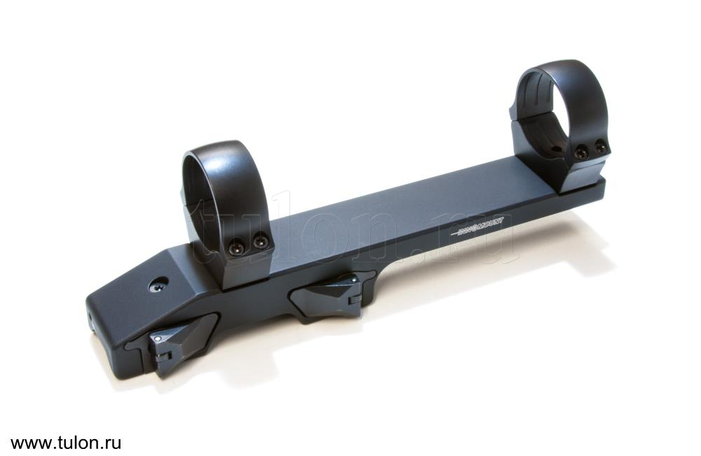 Все очень просто — прислонить ответную часть кронштейна к основе и закрыть зажимной рычаг. Флажок рычага в сложенном положении не возможно открыть случайно. Нажав кнопку с противоположной стороны кронштейна, освобождается флажок запорного механизма, только после этого замок можно открыть и снять кронштейн. Прицельное устройство можно установить или заменить в течении считанных секунд.
