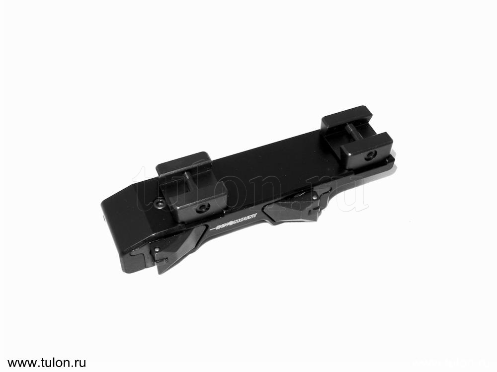 Все очень просто — прислонить ответную часть кронштейна к основе и закрыть зажимной рычаг. Флажок рычага в сложенном положении не возможно открыть случайно. Нажав кнопку с противоположной стороны кронштейна, освобождается флажок запорного механизма, только после этого замок можно открыть и снять кронштейн. Прицельное устройство можно установить или заменить в течении считанных секунд.