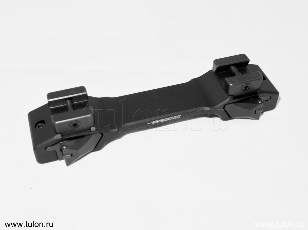 Все очень просто — прислонить ответную часть кронштейна к основе и закрыть зажимной рычаг. Флажок рычага в сложенном положении не возможно открыть случайно. Нажав кнопку с противоположной стороны кронштейна, освобождается флажок запорного механизма, только после этого замок можно открыть и снять кронштейн. Прицельное устройство можно установить или заменить в течении считанных секунд.